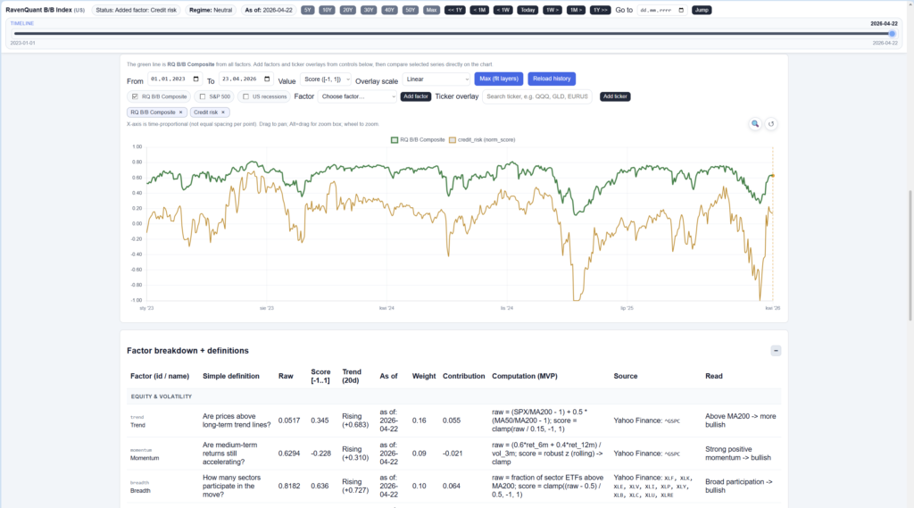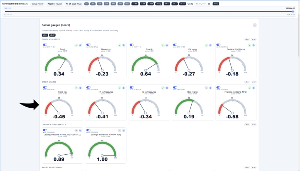 If you want to see how the HY-IG credit spread is currently reading and whether it’s been tightening or widening in recent weeks, it’s one of the inputs tracked in the RavenQuant B/B Index — credit stress that’s building is categorically more concerning than stress that’s peaked and reversing, and the 20-day trend direction captures exactly that distinction.
