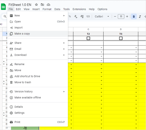 Download your FitSheet to your account. To do this, go to the website goodlesheets.com. In the store on this website you will find everything you need. After making a purchase, you will receive a link to the FitSheet training planner spreadsheet. Make a purchase, download the link, and you’re basically ready. It’s not rocket science.