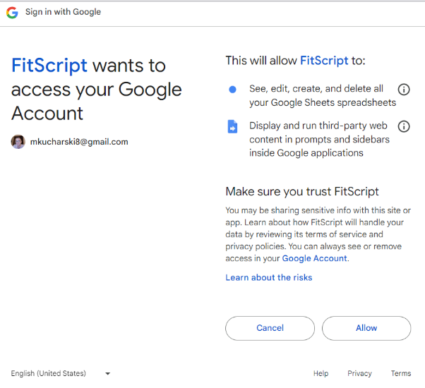 - In the next step, select your Google account, then click Advanced > Open: FitScript (unsafe) and in the last step click Allow.