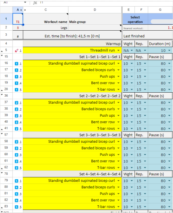 Now enter all the parameters for each exercise in each set, such as the load, number of repetitions, and rest time after each exercise. Columns E:H need to be filled in.
