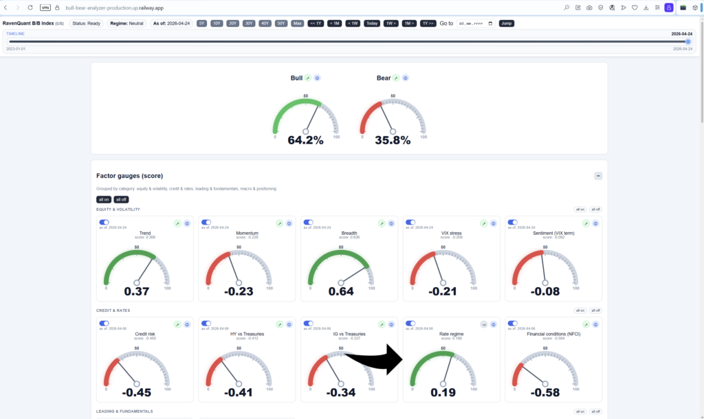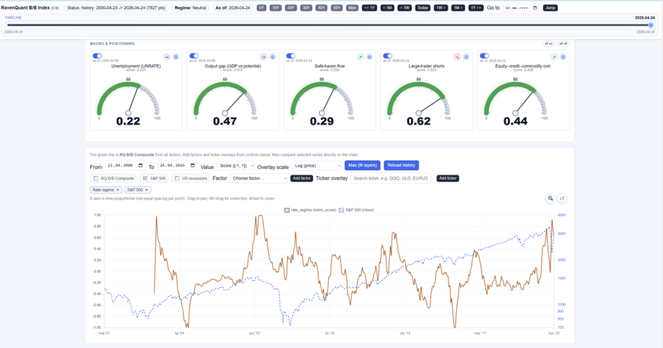The current Rate Regime reading — reflecting the latest T10Y2Y spread from FRED and the DFII10 real yield from FRED — is one of the factors tracked in the RavenQuant B/B Index at ravenquant.com, normalized against its own history with a 20-day trend arrow showing whether the rate backdrop is improving or deteriorating.