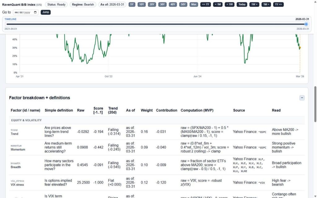 The RavenQuant Bull/Bear Index does something quietly remarkable: it takes the kind of multi-factor regime analysis that institutional desks have been running for decades and puts it on one page with a single slider.